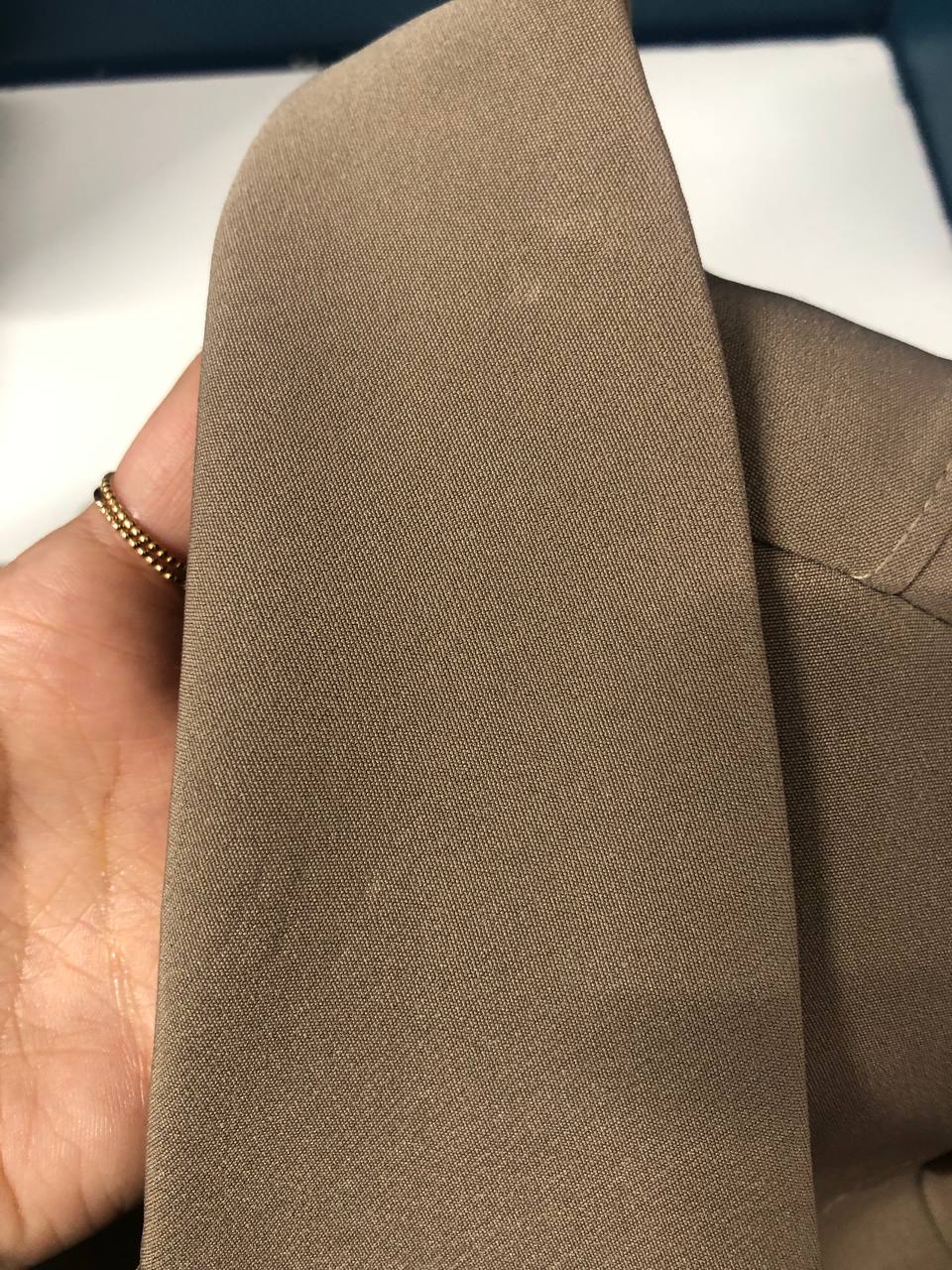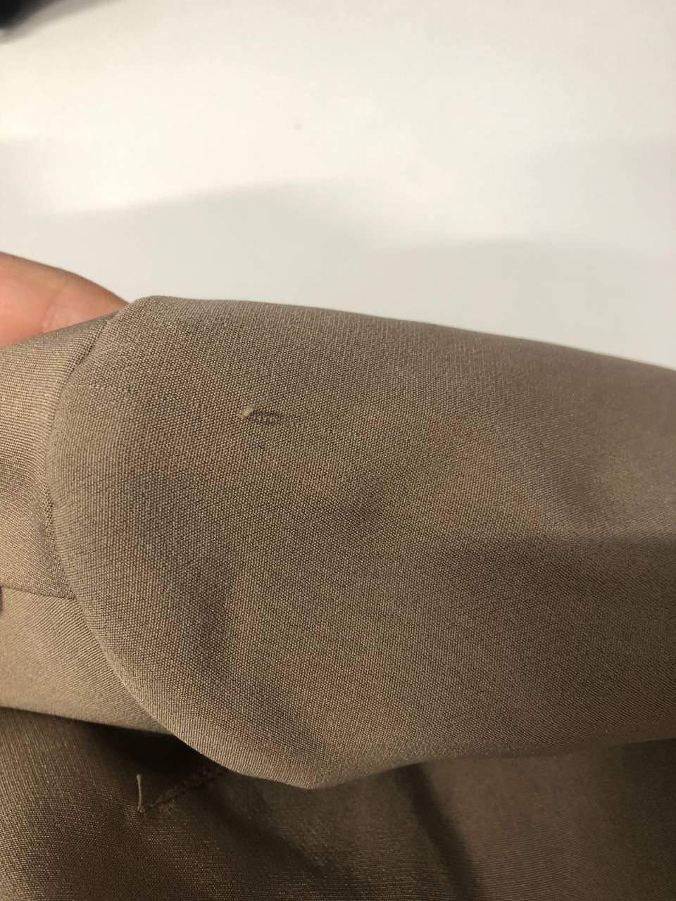 ایراد محصول خاکی 36: نخ کش جزئی قسمت سرشانه و پایین کت- دارای برق اتو جزئی قسمت پشت کت و یقه